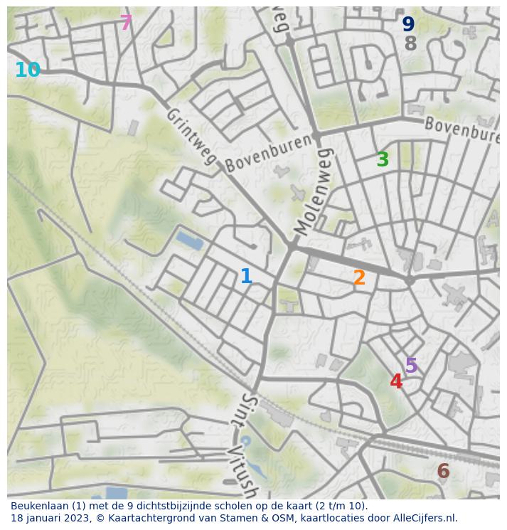 Onderstaande tabel toont het aantal leerlingen van Beukenlaan per postcode van het huisadres van de leerling. Er is een kolom per schooljaar en de eerste kolom toont de som van het aantal leerlingen over alle schooljaren. De gegevens zijn van hoog naar laag gesorteerd op het aantal leerlingen per postcode in schooljaar 2025-2026. Er worden alleen postcodes weergeven waarbij het aantal leerlingen dat in schooljaar 2025-2026 naar Beukenlaan is gegaan minimaal vijf of meer leerlingen is.