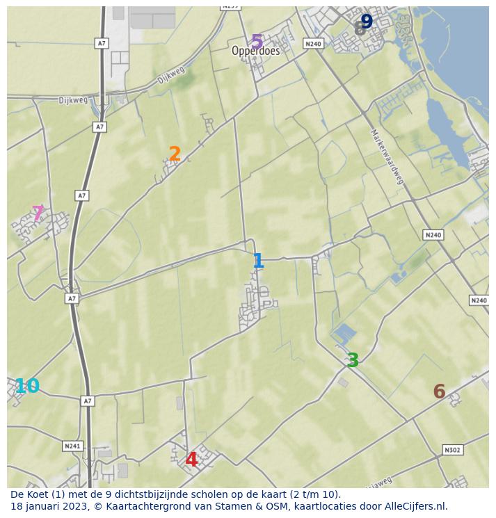 Bovenstaand staafdiagram toont de schoolwegingen in 2025 voor Nederland, de provincie Noord-Holland, de gemeente Medemblik en De Koet.