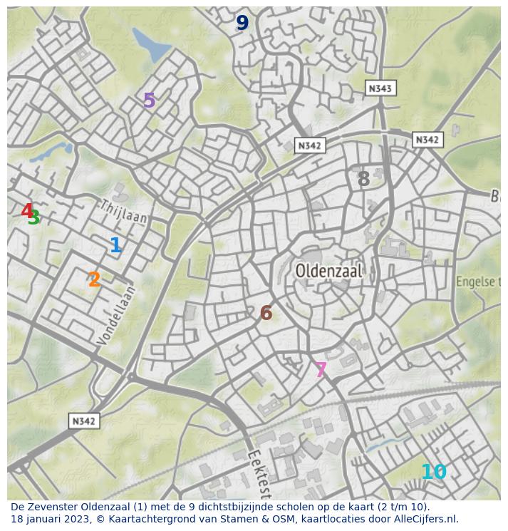 De gemiddelde afstand tussen het woonadres van een leerling en het adres van de school is 2.342 meter. De gemiddelde afstand voor heel Oldenzaal is 1.839 meter.