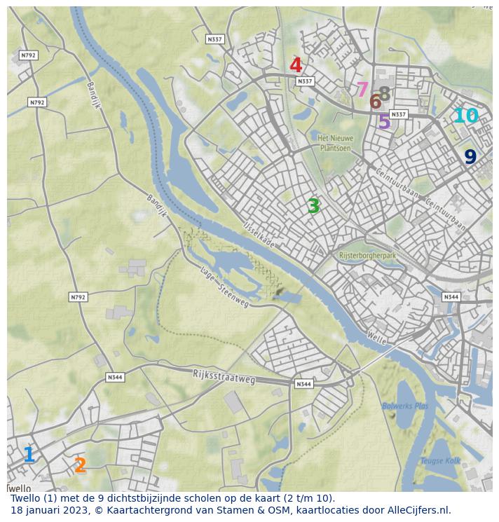 Bovenstaande grafiek toont het aantal leerlingen per type opleiding per schooljaar voor Twello. Omdat sommige scholen gecombineerde brugklassen kennen, is het niet altijd duidelijk of een leerling onder VMBO, HAVO of VWO valt. Daarom zijn voor VMBO, HAVO en VWO de eerste 2 leerjaren onder de noemer 'Brugjaar' geplaatst. HAVO VWO combinatieklassen in leerjaar 3 worden als 'HAVO/VWO' weergegeven.