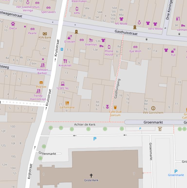 | Achter de Kerk | 6 | 4201EG | Gorinchem | Bijeenkomstfunctie Winkelfunctie | 23 m2 | n.v.t. | 1915 | geen data | ja | Weg |