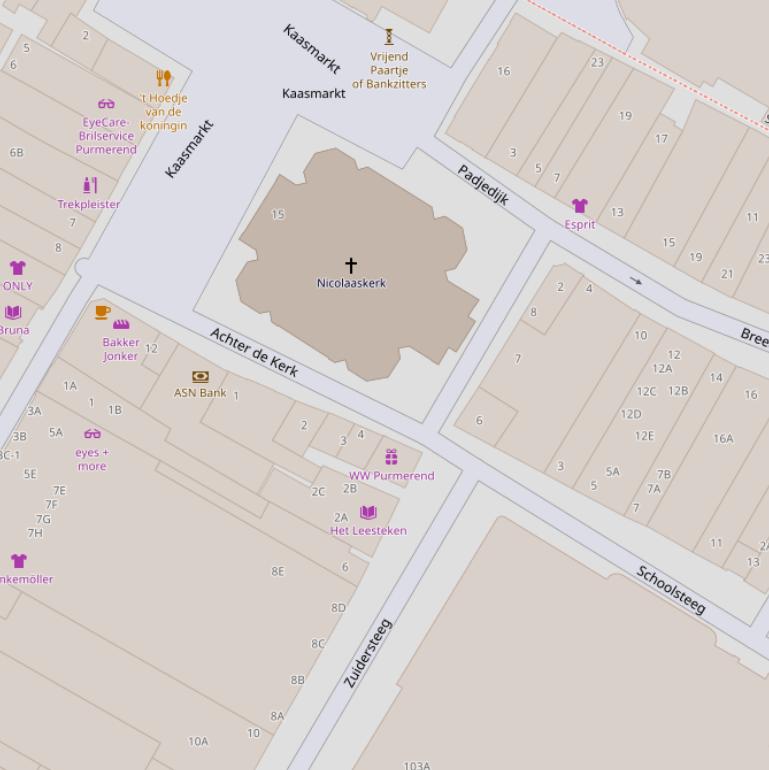 | Achter de Kerk | 5 | 1441BE | Purmerend | Winkelfunctie | 36 m2 | n.v.t. | 1849 | geen data | ja | Weg |