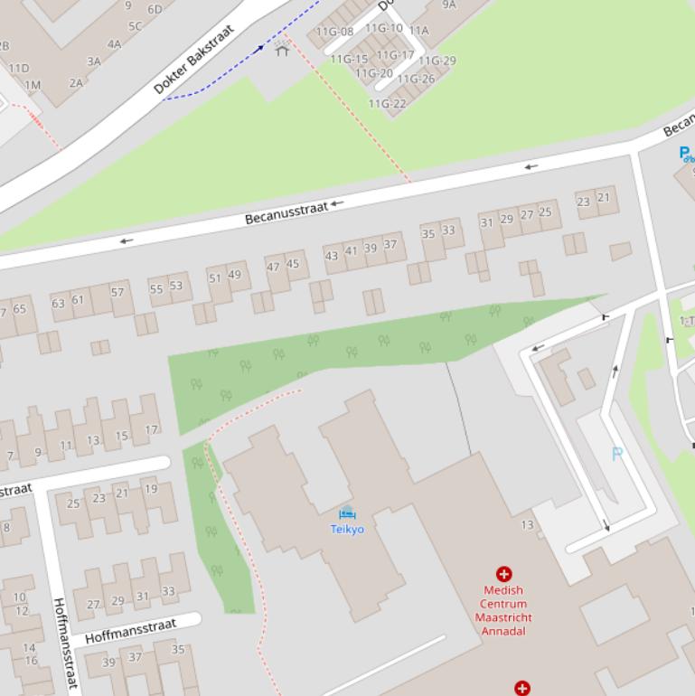 | Becanusstraat | 15 | 6216BX | Maastricht | Gezondheidszorgfunctie | 1.128 m2 | n.v.t. | 1954 | geen data | ja | Weg |