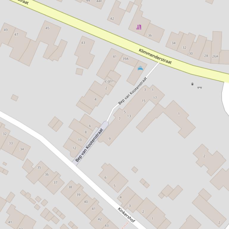 | Bep van Kootenstraat | 2 - g01 | geen postcode | Klimmen | Overige_gebruiksfunctie | 20 m2 | n.v.t. | 1994 | geen data | ja | Weg |