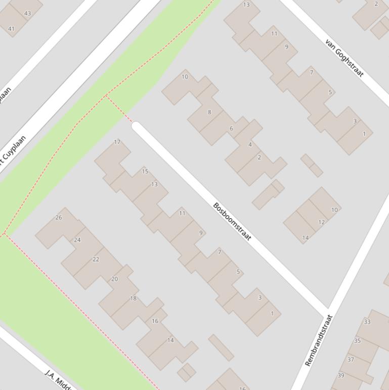 Op deze pagina vind je alle adressen van de Bosboomstraat en de data over diverse onderwerpen die voor de Bosboomstraat bekend zijn in grafieken en tabellen. De gebruikte gegevens zijn afkomstig van het Kadaster, de RVO en afgeleid van de postcodedata van het CBS.