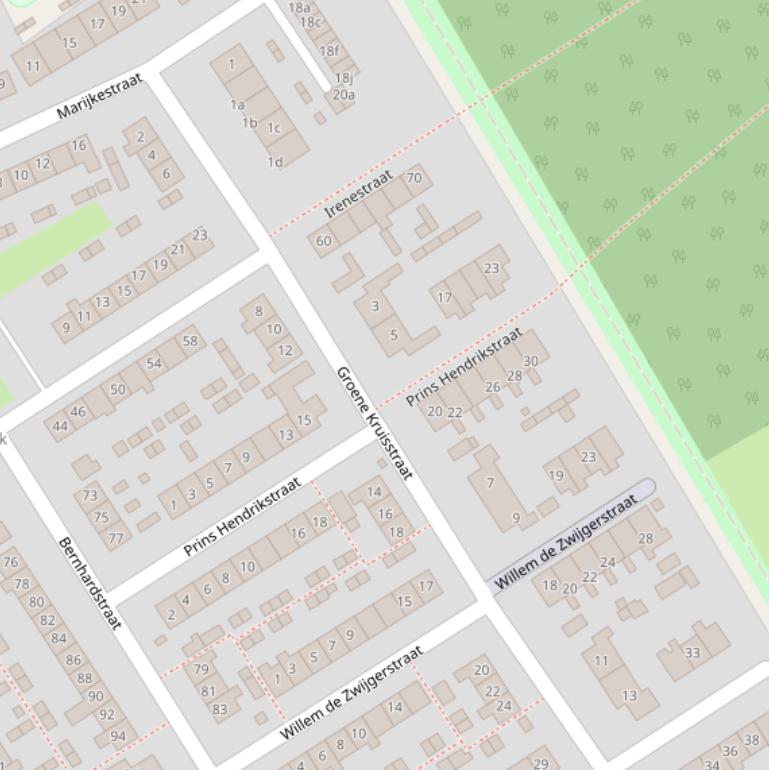Op deze pagina vind je alle adressen van de Groene Kruisstraat en de data over diverse onderwerpen die voor de Groene Kruisstraat bekend zijn in grafieken en tabellen. De gebruikte gegevens zijn afkomstig van het Kadaster, de RVO en afgeleid van de postcodedata van het CBS.