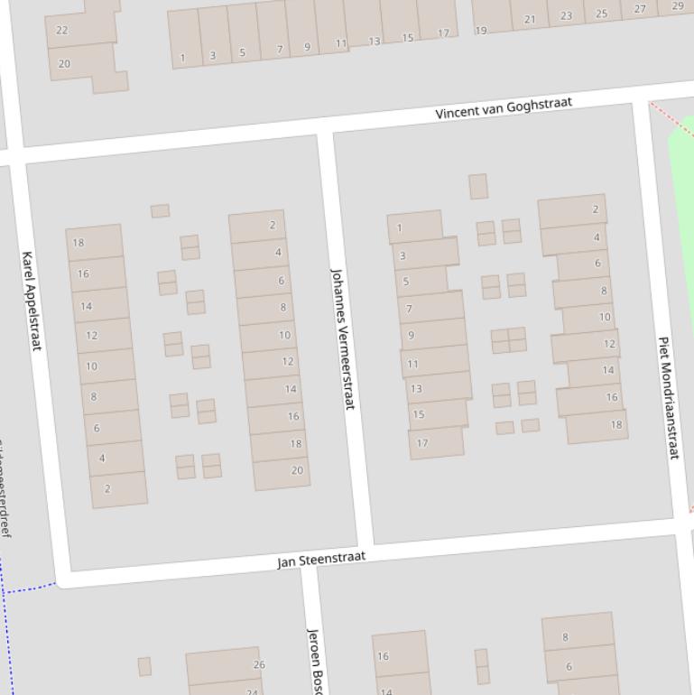 Op deze pagina vind je alle adressen van de Johannes Vermeerstraat en de data over diverse onderwerpen die voor de Johannes Vermeerstraat bekend zijn in grafieken en tabellen. De gebruikte gegevens zijn afkomstig van het Kadaster, de RVO en afgeleid van de postcodedata van het CBS.