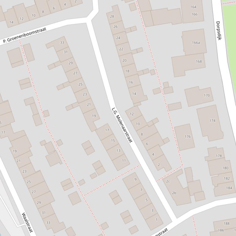 Op deze pagina vind je alle adressen van de L.G. Molenaarstraat en de data over diverse onderwerpen die voor de L.G. Molenaarstraat bekend zijn in grafieken en tabellen. De gebruikte gegevens zijn afkomstig van het Kadaster, de RVO en afgeleid van de postcodedata van het CBS.