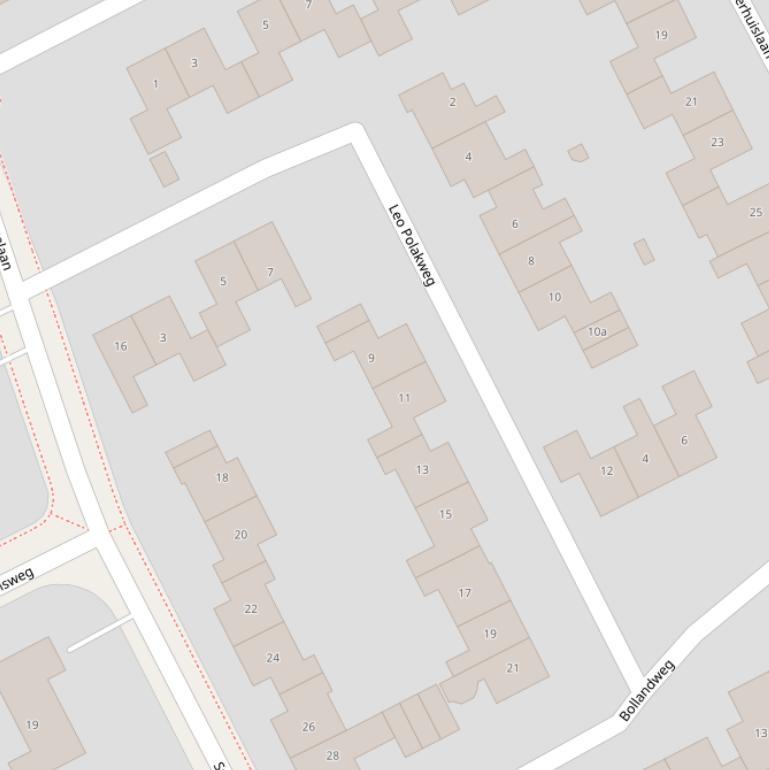 Bovenstaande tabel toont de 16 adressen van de Leo Polakweg. Dit zijn alle adressen op basis van de BAG data van het Kadaster van 1 juli 2025.