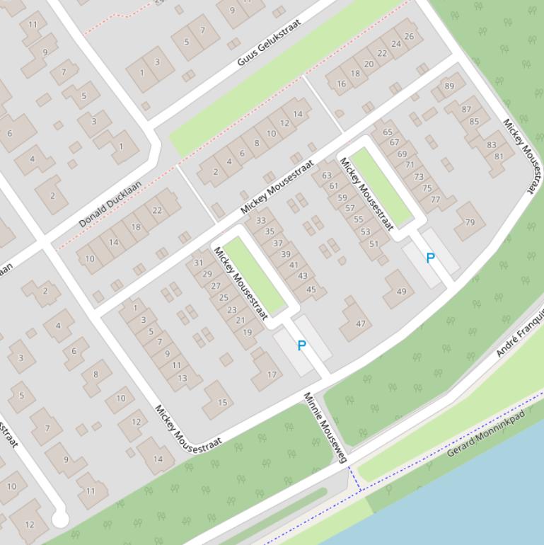De Mickey Mousestraat in Almere telt 52 adressen en die hebben 1336ZG als postcode. Deze weg heeft de huisnummerreeks 1 t/m 89. Weg Mickey Mousestraat ligt in de buurt Stripheldenbuurt Oost binnen de gemeente Almere.