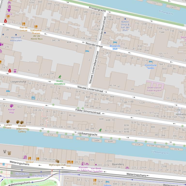 De Nieuwe Looiersstraat in Amsterdam heeft adressen met 6 verschillende postcodes. Deze postcodes lopen van 1017VA tot en met 1017VG. De tabel met adressen op deze pagina toont alle adressen met alle postcodes van Nieuwe Looiersstraat in Amsterdam. Deze weg heeft de huisnummerreeks 1 t/m 156. Weg Nieuwe Looiersstraat ligt in de buurt Weteringbuurt binnen de gemeente Amsterdam.