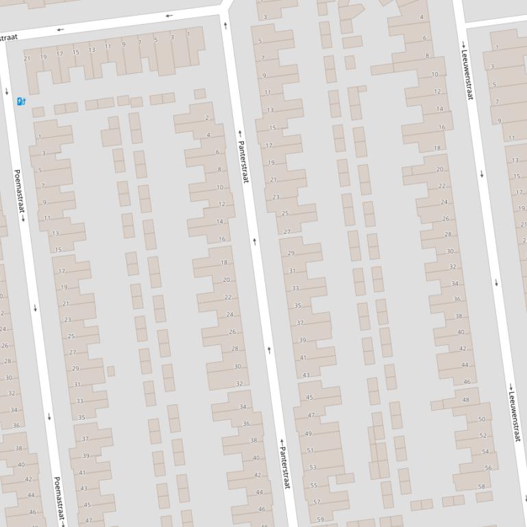 Op deze pagina vind je alle adressen van de Panterstraat en de data over diverse onderwerpen die voor de Panterstraat bekend zijn in grafieken en tabellen. De gebruikte gegevens zijn afkomstig van het Kadaster, de RVO en afgeleid van de postcodedata van het CBS.