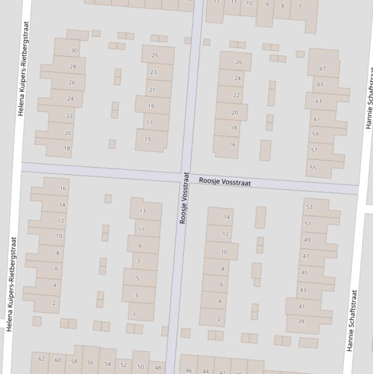 Op deze pagina vind je alle adressen van de Roosje Vosstraat en de data over diverse onderwerpen die voor de Roosje Vosstraat bekend zijn in grafieken en tabellen. De gebruikte gegevens zijn afkomstig van het Kadaster, de RVO en afgeleid van de postcodedata van het CBS.