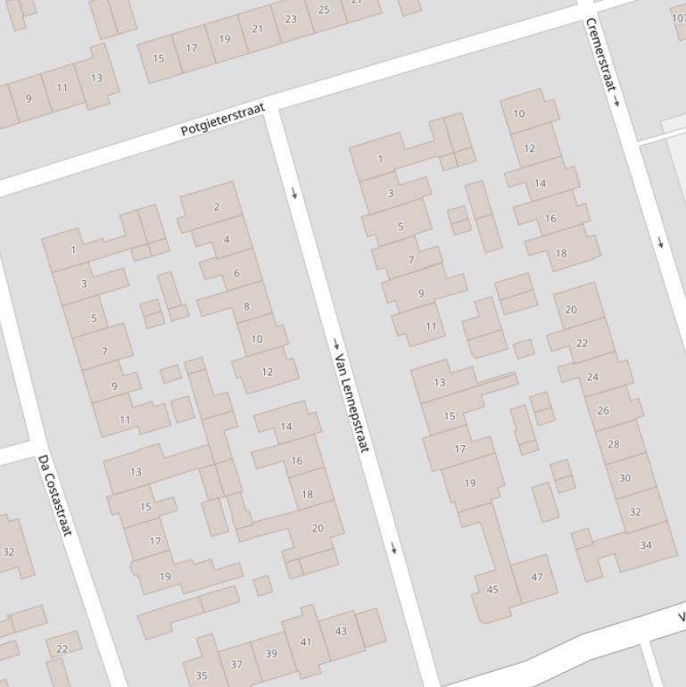 Op deze pagina vind je alle adressen van de Van Lennepstraat en de data over diverse onderwerpen die voor de Van Lennepstraat bekend zijn in grafieken en tabellen. De gebruikte gegevens zijn afkomstig van het Kadaster, de RVO en afgeleid van de postcodedata van het CBS.